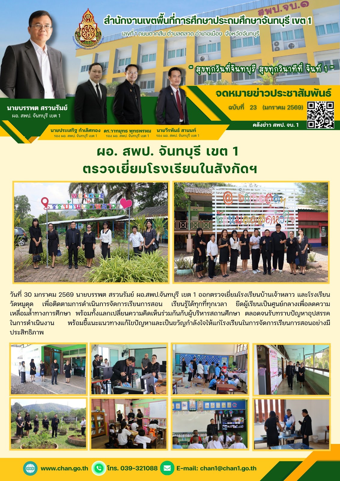ผอ. สพป. จันทบุรี เขต 1 ตรวจเยี่ยมโรงเรียนในสังกัดฯ วันที่ 30 มกราคม 2569 นายบรรพต สรวนรัมย์ ผอ.สพป.จันทบุรี เขต 1 ออกตรวจเยี่ยมโรงเรียนบ้านเจ้าหลาว และโรงเรียนวัดหมูดด เพื่อติดตามการดำเนินการจัดการเรียนการสอน เรี เรียนรู้ได้ทุกที่ทุกเวลา ยึดผู้เรียนเป็นศูนย์กลางเพื่อลดความเหลื่อมลำทางการศึกษา พร้อมทั้งแลกเปลี่ยนความคิดเห็นร่วมกันกับผู้บริหารสถานศึกษา ตลอดจนรับทราบปัญหาอุปสรรคในการดำเนินงาน พร้อมชี้แนะแนวทางแก้ไขปัญหาและเป็นขวัญกำลังใจให้แก่โรงเรียนในการจัดการเรียนการสอนอย่างมีประสิทธิภาพ Related to this topic: สพป.จันทบุรี เขต 1 ลงพื้นที่ติดตามการใช้จ่ายงบประมาณ งบเงินอุดหนุนรายจ่ายประจำปีงบประมาณ พ.ศ.2569 ฉบับที่ 14 ประจำเดือนกุมภาพันธ์ 2569 สพป.จันทบุรี เขต 1 ลงพื้นที่ติดตามการใช้จ่ายงบประมาณ งบเงินอุดหนุนรายจ่ายประจำปีงบประมาณ พ.ศ.2569 ฉบับที่ 13 ประจำเดือนกุมภาพันธ์ 2569 โครงการพัฒนาสมรรถนะการบริหารสถานศึกษามิติใหม่ ฉบับที่ 12 ประจำเดือนกุมภาพันธ์ 2569 การประชุมคณะกรรมการตัดสินการแข่งขันงานศิลปหัตถกรรมนักเรียน ฉบับที่ 11 ประจำเดือนกุมภาพันธ์ 2569 การประชุมการจัดทำแผนบริหารจัดการโรงเรียนขยายโอกาสทางการศึกษา ฉบับที่ 10 ประจำเดือนกุมภาพันธ์ 2569 การประชุมชี้แจงการประเมินความสามารถด้านการอ่านของผู้เรียน (RT) ฉบับที่ 3 ประจำเดือนกุมภาพันธ์ 2569 การประชุมทีมบริหาร สพป. จันทบุรี เขต 1 ฉบับที่ 2 ประจำเดือนกุมภาพันธ์ 2569 การประชุมคณะกรรมการส่งเสริมพหุปัญญาของผู้เรียน การจัดประกวดแข่งขันงานศิลปหัตกรรมนักเรียน ฉบับที่ 1 ประจำเดือนกุมภาพันธ์ 2569 การอบรมเชิงปฏิบัติการ Active Learning ตามหลักสูตรฐานสมรรถนะ ฉบับที่ 27 ประจำเดือนมกราคม 2569 สพป.จันทบุรี เขต 1 ลงพื้นที่ตรวจเยี่ยม สนามสอบ O-NET ฉบับที่ 26 ประจำเดือนมกราคม 2569 การติดตามตรวจสอบการปฏิบัติงานด้านการเงิน การบัญชี ของสถานศึกษา ฉบับที่ 25 ประจำเดือนมกราคม 2569 สพป.จันทบุรี เขต 1 ร่วมมอบเงินและสิ่งของช่วยเหลือบุคลากรที่ประสบเหตุอัคคีภัย ฉบับที่ 24 ประจำเดือนมกราคม 2569