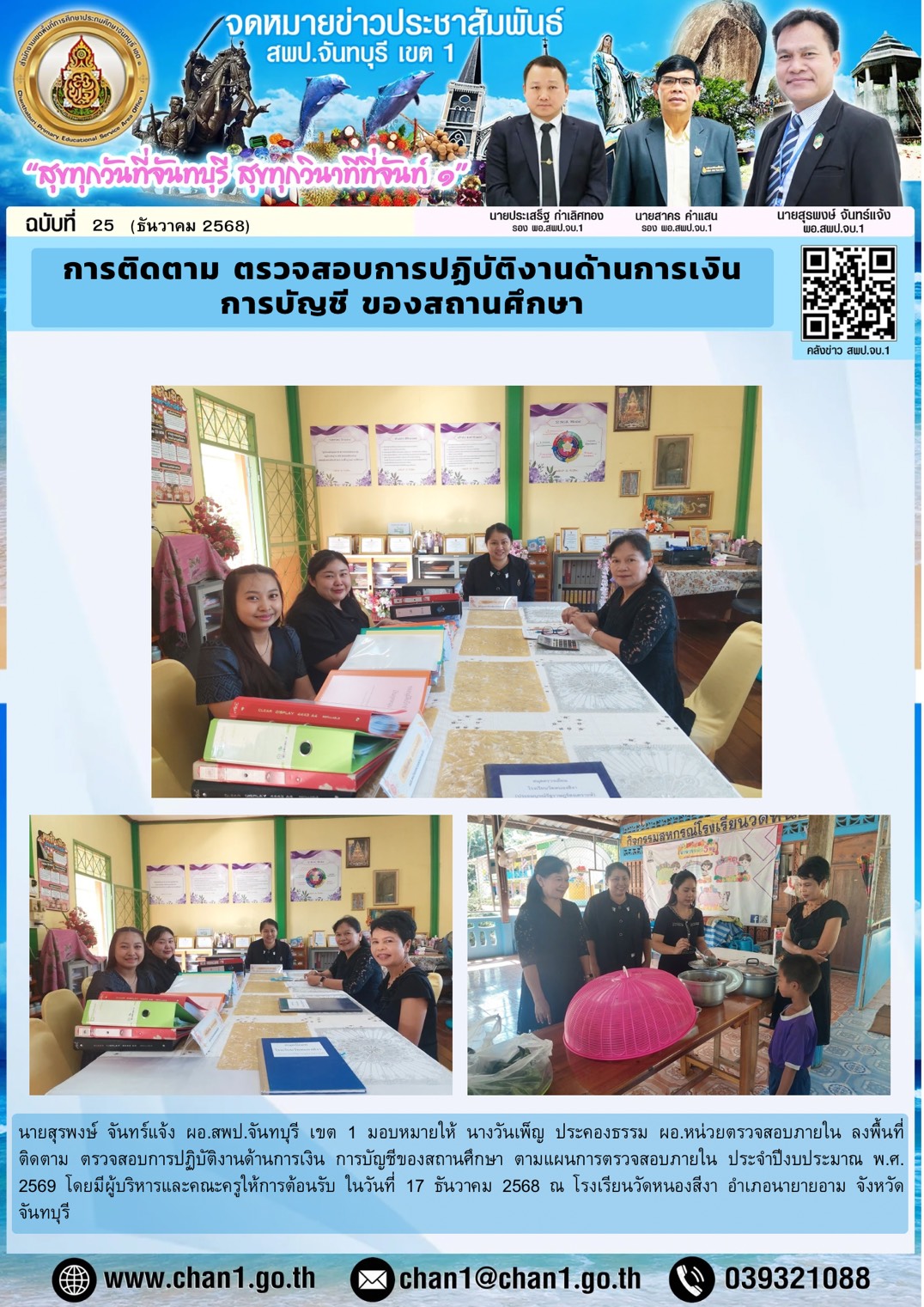 การติดตามตรวจสอบการปฏิบัติงานด้านการเงิน การบัญชี ของสถานศึกษา นายสุรพงษ์ จันทร์แจ้ง ผอ.สพป.จันทบุรี เขต 1 มอบหมายให้ นางวันเพ็ญ ประคองธรรม ผล.หน่วยตรวจสอบภายใน ลงพื้นที่ติดตาม ดรวจสอบการปฏิบัติงานด้านการเงิน การบัญชีของสถานศึกษา ตามแผนการตรวจตอบภายใน ประจำปึงประมาณ พ.ศ.2569 โดยมีผู้บริหารและคณะครให้การต้อนรับ โน้วันที่ 17 ชั้นวาคม 2568 ณ โรงเรียนวัดหนองสีงา อำเภอนายายอาม จังหวัดจันทบุรี Related to this topic: ประชุมคณะกรรมการบริหารเครือข่ายสถานศึกษา ฉบับที่ 26 ประจำเดือนธันวาคม 2568 การติดตามตรวจสอบการปฏิบัติงานด้านการเงิน การบัญชี ของสถานศึกษา ฉบับที่ 25 ประจำเดือนธันวาคม 2568 การติดตามตรวจสอบการปฏิบัติงานด้านการเงิน การบัญชี ของสถานศึกษา ฉบับที่ 24 ประจำเดือนธันวาคม 2568 การติดตาม ตรวจสอบการปฏิบัติงานด้านการเงิน การบัญชี ของสถานศึกษา ฉบับที่ 23 ประจำเดือนธันวาคม 2568 ประชุมคณะกรรมการดำเนินการฯ สหกรณ์ออมทรัพย์ครู ฉบับที่ 22 ประจำเดือนธันวาคม 2568 การติดตาม ตรวจสอบการปฏิบัติงานด้านการเงิน การบัญชี ของสถานศึกษา ฉบับที่ 12 ประจำเดือนธันวาคม 2568 พิธีเปิดศูนย์ประสานงานโครงการอนุรักษ์พันธุกรรมพืชฯ ฉบับที่ 11 ประจำเดือนธันวาคม 2568 งานเปิดตัวหนังสือเจ้าชายน้อยท่องแดนพอเพียง ฉบับที่ 10 ประจำเดือนธันวาคม 2568 การประชุมคณะทำงานจัดทำและดำเนินงานตามข้อตกลงในการพัฒนางาน (PA) ตำแหน่งผู้อำนวยการสำนักงานเขตพื้นที่การศึกษา ฉบับที่ 9 ประจำเดือนธันวาคม 2568 สพป.จันทบุรี เขตุ 1 ร่วมประชุมผู้บริหารระดับสูง สพฐ. ติดตาม สถานการณ์อุทภภัยนำท่วมและติดตามสถานการณ์ความไม่สงบบริเวณ พื้นที่ชายแดนไทย - กัมพูชา ฉบับที่ 8 ประจำเดือนธันวาคม 2568 กิจกรรมเนื่องในวันคล้ายวันพระบรมราชสมภพพระบาทสมเด็จพระบรมชนกาธิเบศรมหาภูมิพลอดุลยเดชมหาราช ฉบับที่ 6 ประจำเดือนธันวาคม 2568 การติดตาม ตรวจสอบการปฏิบัติงานด้านการเงิน การบัญชี ของสถานศึกษา ฉบับที่ 4 ประจำเดือนธันวาคม 2568