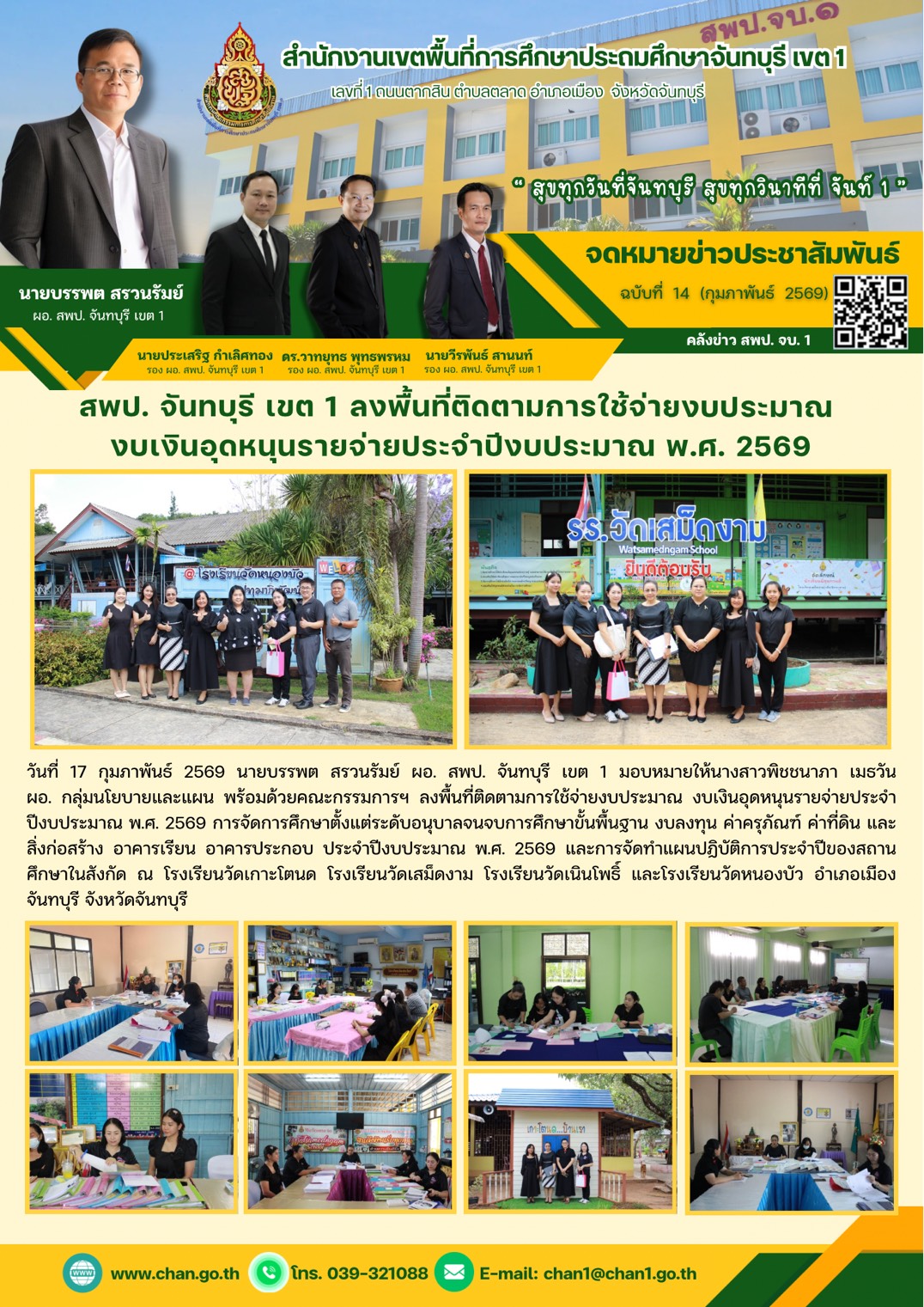 สพป.จันทบุรี เขต 1 ลงพื้นที่ติดตามการใช้จ่ายงบประมาณ งบเงินอุดหนุนรายจ่ายประจำปีงบประมาณ พ.ศ.2569 ฉบับที่ 14 ประจำเดือนกุมภาพันธ์ 2569