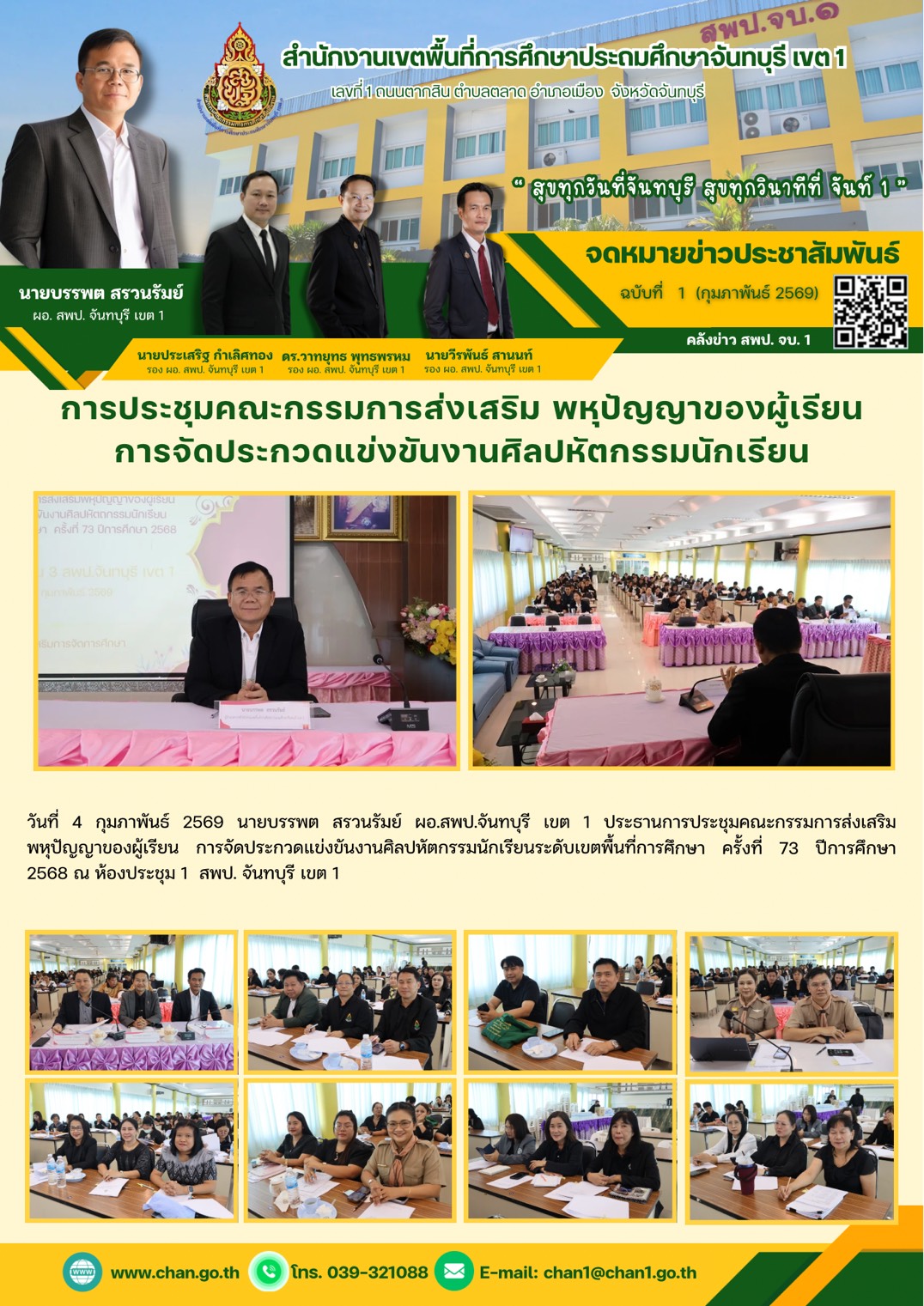 การประชุมคณะกรรมการส่งเสริมพหุปัญญาของผู้เรียน การจัดประกวดแข่งขันงานศิลปหัตกรรมนักเรียน วันที่ 4 กุมภาพันธ์ 2569 นายบรรพต สรวนรัมย์ ผอ.สพป.จันทบุรี เขต 1 ประธานการประชุมคณะกรรมการส่งเสริมพหุปัญญาของผู้เรียน การจัดประกวดแข่งยันงานศิลปทัตกรรมนักเรียนระดับเขตพื้นที่การศึกษา ครั้งที่ 73 ปีการศึกษา 2568 ณ ห้องประชุม 1 สพป.จันทบุรี เขต 1 Related to this topic: สพป.จันทบุรี เขต 1 ลงพื้นที่ติดตามการใช้จ่ายงบประมาณ งบเงินอุดหนุนรายจ่ายประจำปีงบประมาณ พ.ศ.2569 ฉบับที่ 14 ประจำเดือนกุมภาพันธ์ 2569 สพป.จันทบุรี เขต 1 ลงพื้นที่ติดตามการใช้จ่ายงบประมาณ งบเงินอุดหนุนรายจ่ายประจำปีงบประมาณ พ.ศ.2569 ฉบับที่ 13 ประจำเดือนกุมภาพันธ์ 2569 โครงการพัฒนาสมรรถนะการบริหารสถานศึกษามิติใหม่ ฉบับที่ 12 ประจำเดือนกุมภาพันธ์ 2569 การประชุมคณะกรรมการตัดสินการแข่งขันงานศิลปหัตถกรรมนักเรียน ฉบับที่ 11 ประจำเดือนกุมภาพันธ์ 2569 การประชุมการจัดทำแผนบริหารจัดการโรงเรียนขยายโอกาสทางการศึกษา ฉบับที่ 10 ประจำเดือนกุมภาพันธ์ 2569 การประชุมชี้แจงการประเมินความสามารถด้านการอ่านของผู้เรียน (RT) ฉบับที่ 3 ประจำเดือนกุมภาพันธ์ 2569 การประชุมทีมบริหาร สพป. จันทบุรี เขต 1 ฉบับที่ 2 ประจำเดือนกุมภาพันธ์ 2569 การประชุมคณะกรรมการส่งเสริมพหุปัญญาของผู้เรียน การจัดประกวดแข่งขันงานศิลปหัตกรรมนักเรียน ฉบับที่ 1 ประจำเดือนกุมภาพันธ์ 2569 การอบรมเชิงปฏิบัติการ Active Learning ตามหลักสูตรฐานสมรรถนะ ฉบับที่ 27 ประจำเดือนมกราคม 2569 สพป.จันทบุรี เขต 1 ลงพื้นที่ตรวจเยี่ยม สนามสอบ O-NET ฉบับที่ 26 ประจำเดือนมกราคม 2569 การติดตามตรวจสอบการปฏิบัติงานด้านการเงิน การบัญชี ของสถานศึกษา ฉบับที่ 25 ประจำเดือนมกราคม 2569 สพป.จันทบุรี เขต 1 ร่วมมอบเงินและสิ่งของช่วยเหลือบุคลากรที่ประสบเหตุอัคคีภัย ฉบับที่ 24 ประจำเดือนมกราคม 2569