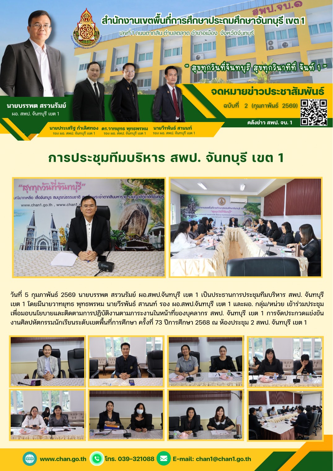 การประชุมทีมบริหาร สพป. จันทบุรี เขต 1 วันที่ 5 กุมภาพันธ์ 2569 นายบรรพต สรวนรัมย์ ผอ.สพป.จันทบุรี เขต 1 เป็นประธานการประชุมทีมบริหาร สพป.จันทบุรี เขต 1 โดยมีนายวาทยุทธ พุทธพรหม นายวีรพันธ์ สานนท์ รอง ผอ.สพป.จันทบุรี เขต 1 และผอ. กลุ่ม/หน่วย เข้าร่วมประชุม เพื่อมอบนโยบาย และติดตามการปฏิบัติงานตามภาระงานในหน้าที่ของบุคลากร สพป.จันทบุรี เขต 1 การจัดประกวดแข่งขันงานศิลปหัตกรรมนักเรียนระดับเขตพื้นที่การศึกษา ครั้งที่ 73 ปีการศึกษา 2568 ณ ห้องประชุม 2 สพป.จันทบุรี เขต 1 Related to this topic: สพป.จันทบุรี เขต 1 ลงพื้นที่ติดตามการใช้จ่ายงบประมาณ งบเงินอุดหนุนรายจ่ายประจำปีงบประมาณ พ.ศ.2569 ฉบับที่ 14 ประจำเดือนกุมภาพันธ์ 2569 สพป.จันทบุรี เขต 1 ลงพื้นที่ติดตามการใช้จ่ายงบประมาณ งบเงินอุดหนุนรายจ่ายประจำปีงบประมาณ พ.ศ.2569 ฉบับที่ 13 ประจำเดือนกุมภาพันธ์ 2569 โครงการพัฒนาสมรรถนะการบริหารสถานศึกษามิติใหม่ ฉบับที่ 12 ประจำเดือนกุมภาพันธ์ 2569 การประชุมคณะกรรมการตัดสินการแข่งขันงานศิลปหัตถกรรมนักเรียน ฉบับที่ 11 ประจำเดือนกุมภาพันธ์ 2569 การประชุมการจัดทำแผนบริหารจัดการโรงเรียนขยายโอกาสทางการศึกษา ฉบับที่ 10 ประจำเดือนกุมภาพันธ์ 2569 การประชุมชี้แจงการประเมินความสามารถด้านการอ่านของผู้เรียน (RT) ฉบับที่ 3 ประจำเดือนกุมภาพันธ์ 2569 การประชุมทีมบริหาร สพป. จันทบุรี เขต 1 ฉบับที่ 2 ประจำเดือนกุมภาพันธ์ 2569 การประชุมคณะกรรมการส่งเสริมพหุปัญญาของผู้เรียน การจัดประกวดแข่งขันงานศิลปหัตกรรมนักเรียน ฉบับที่ 1 ประจำเดือนกุมภาพันธ์ 2569 การอบรมเชิงปฏิบัติการ Active Learning ตามหลักสูตรฐานสมรรถนะ ฉบับที่ 27 ประจำเดือนมกราคม 2569 สพป.จันทบุรี เขต 1 ลงพื้นที่ตรวจเยี่ยม สนามสอบ O-NET ฉบับที่ 26 ประจำเดือนมกราคม 2569 การติดตามตรวจสอบการปฏิบัติงานด้านการเงิน การบัญชี ของสถานศึกษา ฉบับที่ 25 ประจำเดือนมกราคม 2569 สพป.จันทบุรี เขต 1 ร่วมมอบเงินและสิ่งของช่วยเหลือบุคลากรที่ประสบเหตุอัคคีภัย ฉบับที่ 24 ประจำเดือนมกราคม 2569