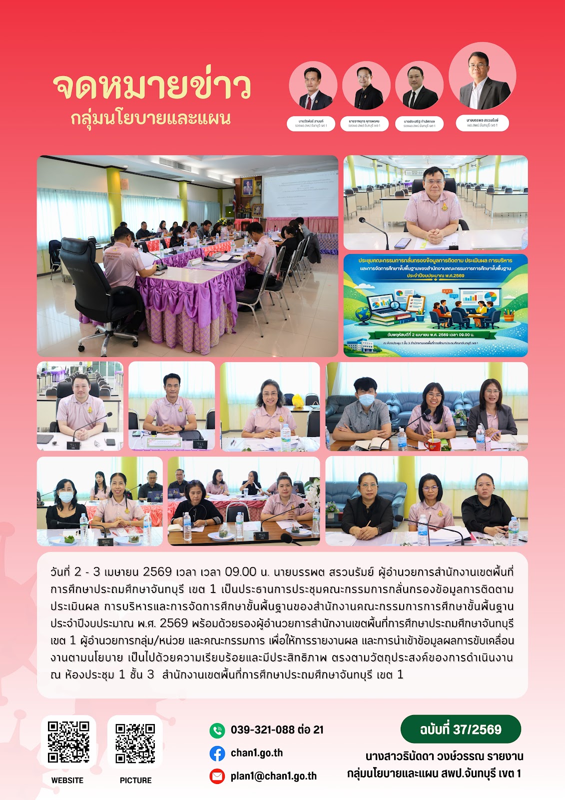 ฉบับที่ 37 วันที่ 2-3 เม.ย. 2569 ประชุมคณะกรรมการกลั่นกรองข้อมูลการติดตาม ประเมินผล การบริหารและการจัดการศึกษาขั้นพื้นฐานของ สพฐ. ประจำปีงบประมาณ พ.ศ. 2569 กลุ่มนโยบายและแผน 9 เม.ย 2569 2