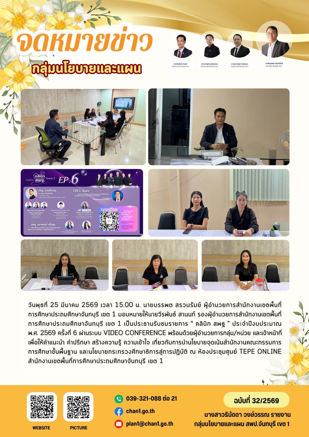 ฉบับที่ 32 วันที่ 25 มี.ค. 2569 คลินิก สพฐ. ประจำปีงบประมาณ พ.ศ. 2569 ครั้งที่ 6 กลุ่มนโยบายและแผน 31 มี.ค 2569 2