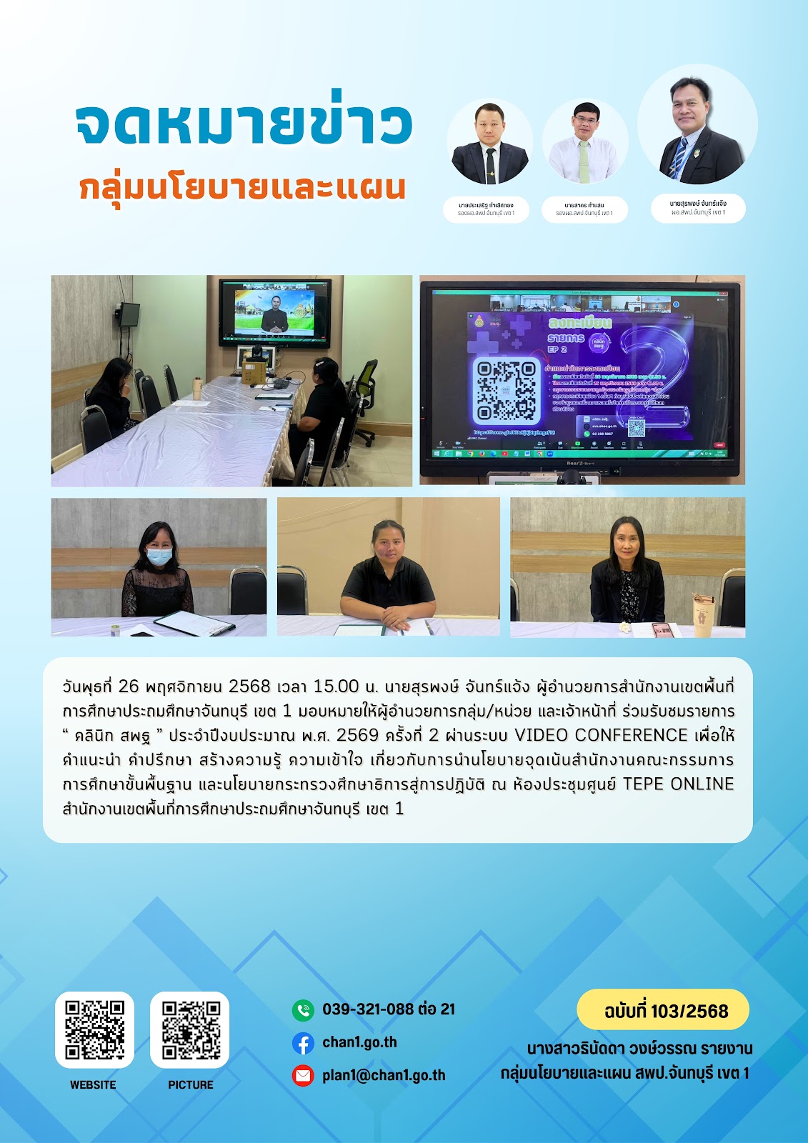 ฉบับที่ 103 วันที่ 26 พ.ย. 2568 คลินิก สพฐ. ประจำปีงบประมาณ พ.ศ. 2569 ครั้งที่ 2 กลุ่มนโยบายและแผน 27 พ.ย 2568 2