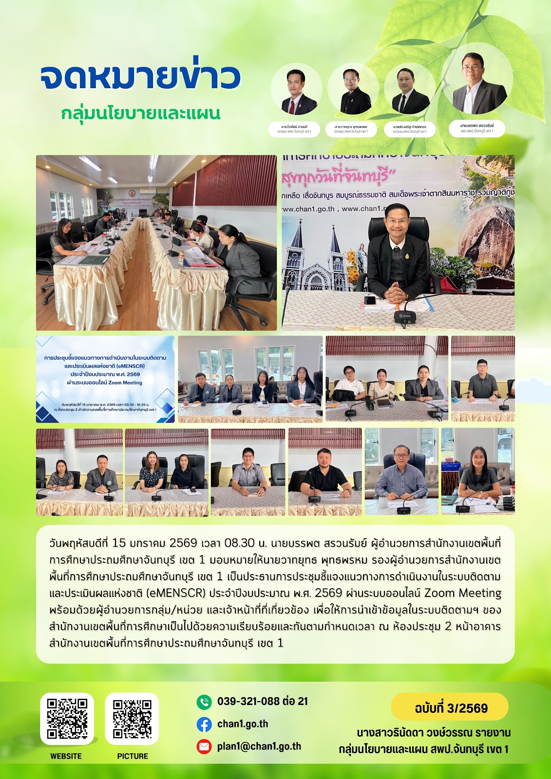 ฉบับที่ 3 วันที่ 15 ม.ค. 2569 ประชุมชี้แจงแนวทางการดำเนินงานในระบบติดตาม และประเมินผลแห่งชาติ (eMENSCR) ประจำปีงบประมาณ พ.ศ. 2569 ผ่านระบบออนไลน์ Zoom Meeting กลุ่มนโยบายและแผน 15 ม.ค 2569 2