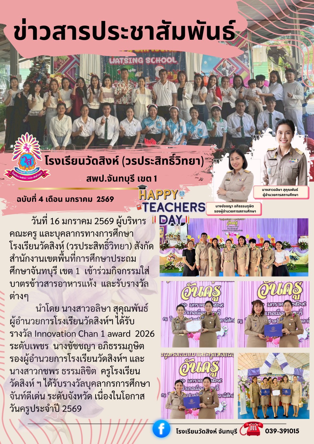 วันครูประจำปี 2569 นิเทศก์ News คลินิกวิชาการสารสัมพันธ์ ปีที่ 4 ฉบับที่ 1 | กลุ่มนิเทศฯ สพป.จันทบุรี เขต 1 31 ธ.ค 2568 · 100 รายงานผลการประเมินพัฒนาการนักเรียนที่จบหลักสูตรการศึกษาปฐมวัย พุทธศักราช 2560 ปีการศึกษา 2567 26 ธ.ค 2568 · 100 รายงานผลการประเมินพัฒนาการเด็กปฐมวัย ปีการศึกษา 2567 26 ธ.ค 2568 · 100 คลินิกวิชาการสารสัมพันธ์ ปีที่ 3 ฉบับที่ 32 | กลุ่มนิเทศฯ สพป.จันทบุรี เขต 1 30 ธ.ค 2568 · 100 คลินิกวิชาการสารสัมพันธ์ ปีที่ 3 ฉบับที่ 31| กลุ่มนิเทศฯ สพป.จันทบุรี เขต 1 4 ธ.ค 2568 · 100 ผลงานการน้อมนำพระบรมราโชบายสู่การปฏิบัติที่เป็นต้นแบบหรือเป็นแบบอย่างได้ ปีการศึกษา 2567-2568 3 ธ.ค 2568 · 100 คลินิกวิชาการสารสัมพันธ์ ปีที่ 3 ฉบับที่ 30| กลุ่มนิเทศฯ สพป.จันทบุรี เขต 1 19 พ.ย 2568 · 100 ประชาสัมพันธ์การสอบ " RT NT" ปีการศึกษา 2568 18 พ.ย 2568 · 100 คลินิกวิชาการสารสัมพันธ์ ปีที่ 3 ฉบับที่ 29| กลุ่มนิเทศฯ สพป.จันทบุรี เขต 1 18 พ.ย 2568 · 100 คลินิกวิชาการสารสัมพันธ์ ปีที่ 3 ฉบับที่ 28 | กลุ่มนิเทศฯ สพป.จันทบุรี เขต 1 18 พ.ย 2568 · 100 ข่าวประชาสัมพันธ์ สพป.จันทบุรี เขต 1 กิจกรรมวันเด็กแห่งชาติโรงเรียนวัดจันทนาราม ฉบับที่ 1 ประจำเดือนมกราคม 2569 ประชุมคณะกรรมการบริหารเครือข่ายสถานศึกษา ฉบับที่ 26 ประจำเดือนธันวาคม 2568 การติดตามตรวจสอบการปฏิบัติงานด้านการเงิน การบัญชี ของสถานศึกษา ฉบับที่ 25 ประจำเดือนธันวาคม 2568 การติดตามตรวจสอบการปฏิบัติงานด้านการเงิน การบัญชี ของสถานศึกษา ฉบับที่ 24 ประจำเดือนธันวาคม 2568 เนื้อหาที่น่าสนใจ ประกาศ การขึ้นบัญชีผู้สอบแข่งขันได้ กรณีการนำบัญชีผู้สอบแข่งขันได้ในบัญชีหนึ่งไปขึ้นบัญชีเป็นผู้สอบแข่งขันได้ในบัญชีอื่น เพื่อบรรจุและแต่งตั้งเข้ารับราชการเป็นข้าราชการครูและบุคลากรทางการศึกษา ตำแหน่งครูผู้ช่วย 21 ม.ค 2569 วันครูประจำปี 2569 20 ม.ค 2569 โรงเรียนวัดสิงห์ฯ ได้เข้าร่วมการนำเสนอผลการดำเนินงานสถานศึกษาปลอดภัย 20 ม.ค 2569 ฉบับที่ 3 วันที่ 15 ม.ค. 2569 ประชุมชี้แจงแนวทางการดำเนินงานในระบบติดตาม และประเมินผลแห่งชาติ (eMENSCR) ประจำปีงบประมาณ พ.ศ. 2569 ผ่านระบบออนไลน์ Zoom Meeting 15 ม.ค 2569